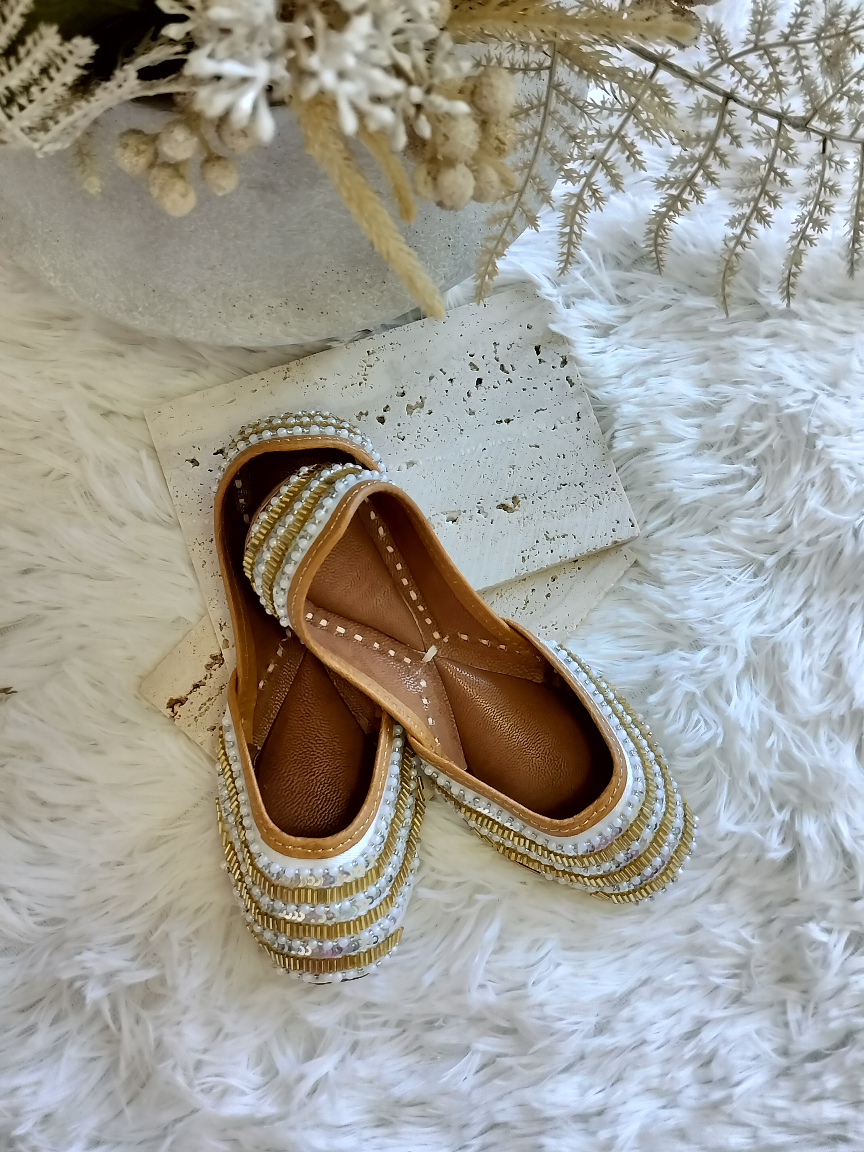 Full of silver beads, golden sequins and white pearls exudes a elegance bling to your princess's feet.