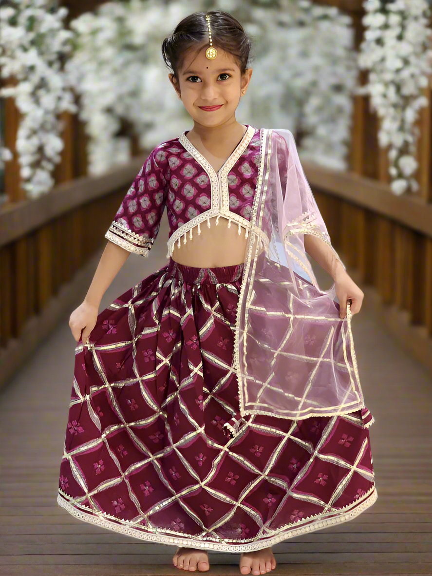 Beautiful Lehnga Choli in wine colour complemented with light coloured net dupatta. The top and bottom has beautiful detailing of laces work.