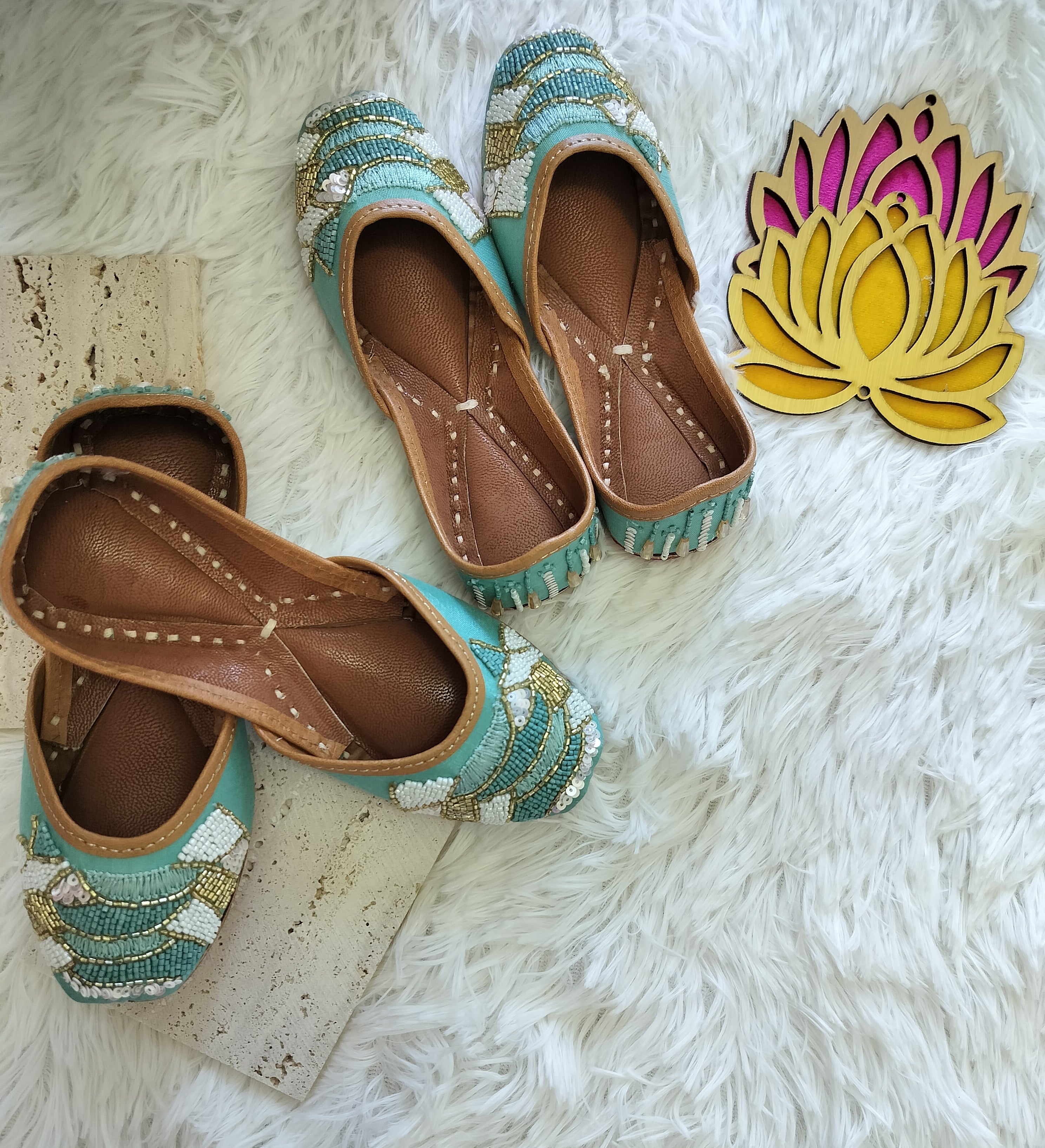 This stunning green jutti is a perfect blend of tradition and elegance, designed to enhance your little one's ethnic attire. Full of golden and green sequins with white beads, will be timeless addition to your little one's wardrobe.
