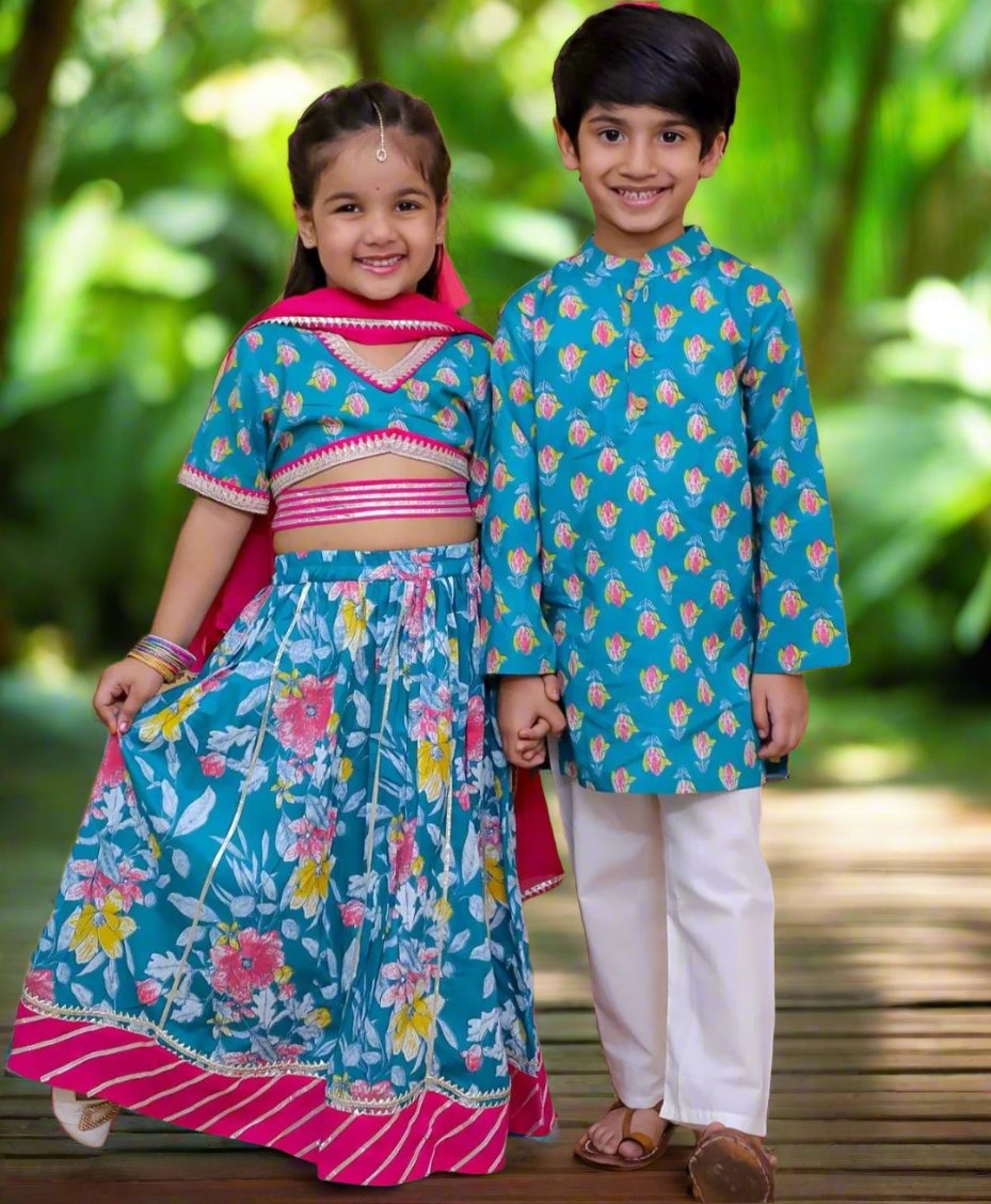 Cute designer printed top with printed ghagra. The top and skirt has beautiful detailing of specially designed lace work and beautiful rani dupatta.