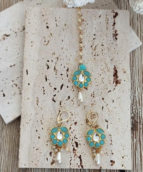 Gold-plated turquoise blue maang tikka has white kundan stone-studded and white faux pearls-beaded details secured with a hook closure. Comes with beautiful matching earrings as a set.
